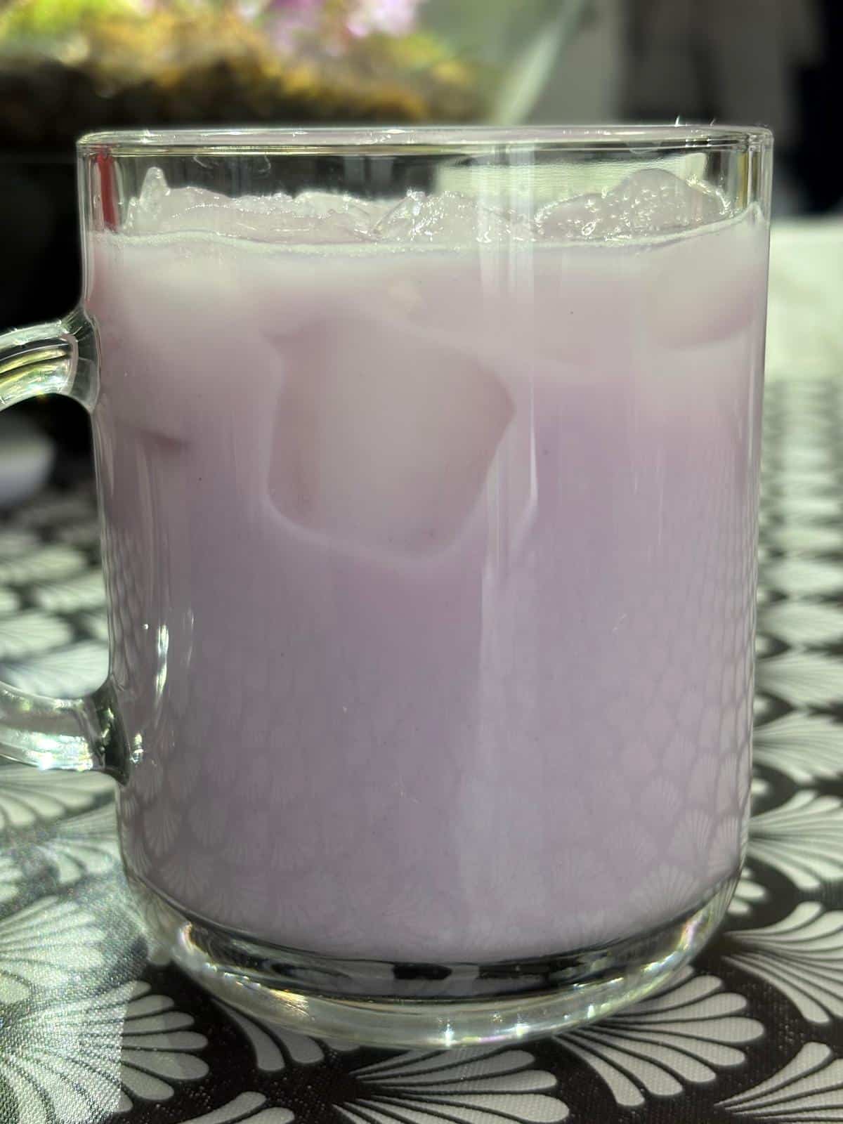 Adepte des teatimes et des lattes (chaï latte, matcha latte, golden latte, blue latte) j’ai testé pour vous l’Ube de Lilaya en version latte. Cette dernière se prépare en un tour de main en moins de 5 min. Il suffit d’ajouter deux cuillères à café de poudre d’Ube dans un fond d’eau chaude, et de mélanger. Puis dans un second temps d’ajouter des glaçons dans un verre avec 1/2 l’eau et 1/2 de lait.